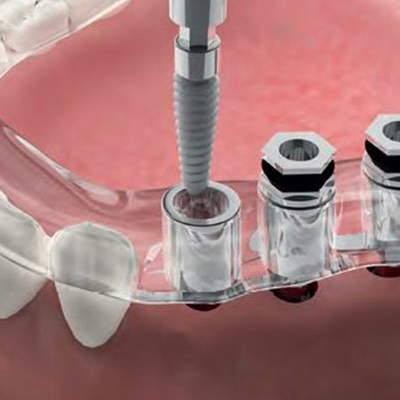L’implantologia guidata prevede una scansione tridimensionale delle arcate dentali attraverso una T.A.C. 3D in modo da poter ricostruire alla perfezione l’osso e le strutture anatomiche del paziente. Attraverso questa ricostruzione viene elaborata una mascherina in resina che presenta dei fori, che fungono da guida per l’esatta collocazione dell’impianto. Questa tecnica permette grande precisione e riduce al massimo il taglio e i punti di sutura.